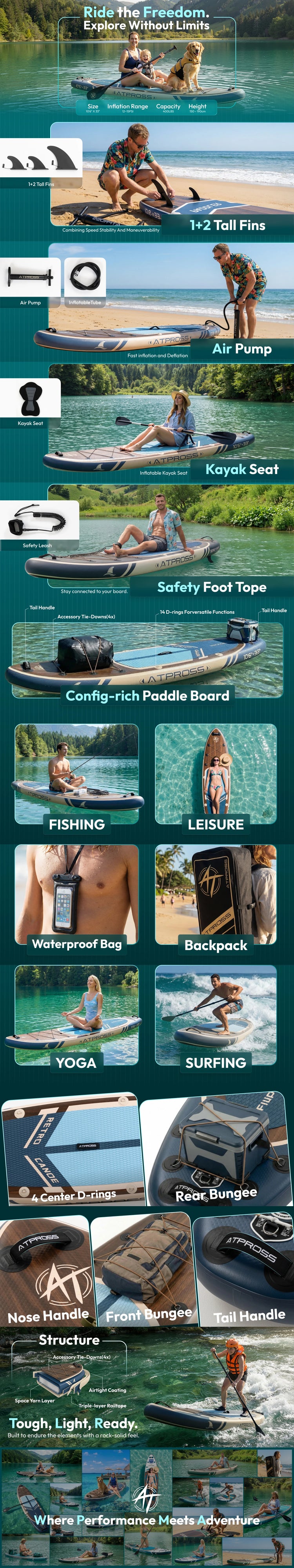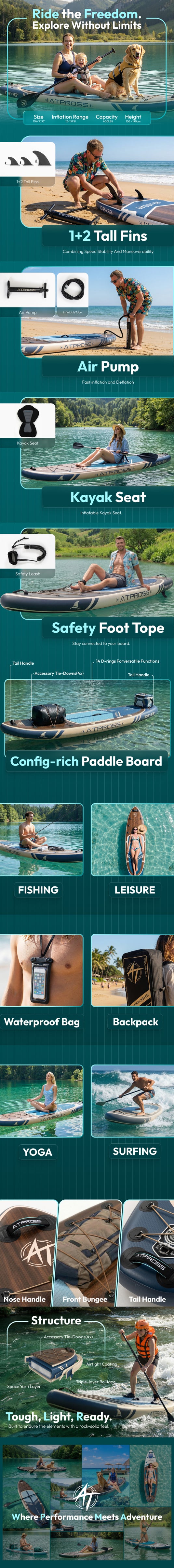 The inflatable stand-up paddleboard has far beyond my expectations. Both novice paddlers and those with more expertise will find the deck's extra-wide, non-slip surface to be an excellent source of stability. Despite the fact that I am able to stand and move around with ease, the weight capability of 450 pounds allows me to easily carry both myself and my equipment.The pump and accessories that are included in the package make the setup process straightforward, and the backpack makes it simple to transfer to the water. All of the activities that I have tried it out for, including yoga, fishing, and paddling around in general, have been really successful. The material has a robust and long-lasting feel, and after it has been inflated, the board is able to keep its shape very well.This is a fantastic option for anyone looking for an inflatable paddle board that is dependable, sturdy, and diverse in its application. It is not only enjoyable but also useful, and it has everything that is required for a wonderful day on the lake.