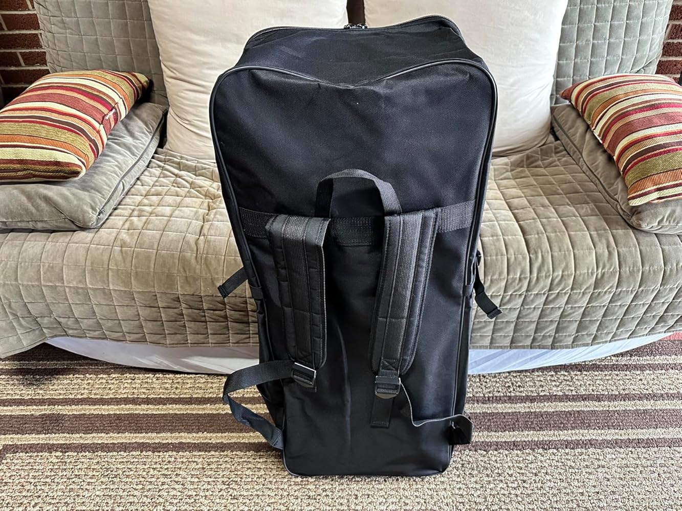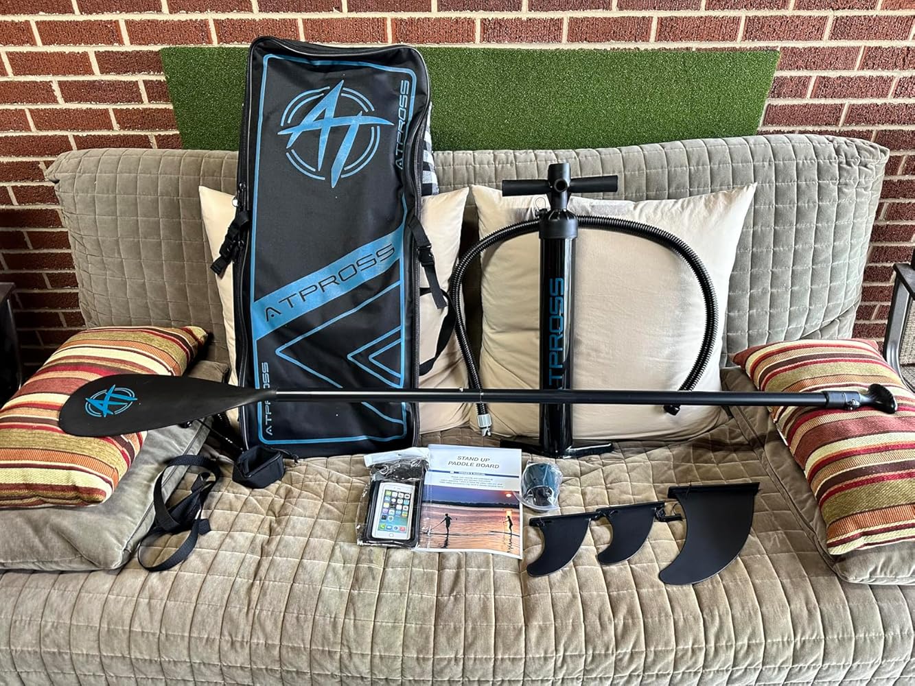 My first paddle board cost over $2,000 and it was a custom-made hardboard. It was really a pain to move that thing around. Inflatable paddle boards have gotten so good and the quality standards even at the entry level price points are exceptional. This is a good example a very well made paddle board in a stable 10 ft 6 in length and 33 inch width. These dimensions make paddling easy for any level of experience. This kit comes with a case, fins and leash, a pump, a waterproof phone case which is a bonus, and up three piece breakdown paddle. When you first open it up there will be some off-gassing of the vinyl. So if that bothers you let it air out for a day outside. I'm going to inflate it at about 25% and air it out when the weather warms up. Please learn from my mistake and that is never leave an inflatable paddle board it out in the sunshine without taking at least 50% of the air out of it. I made this expensive mistake with my last inflatable not taking enough air out and in the hot sun the air expanded and blew out the sides of the paddle board. So learn from my mistake.